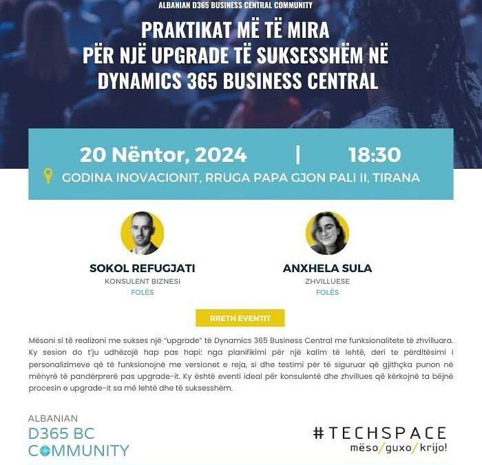 Jeni të ftuar të bashkoheni me ne në një sesion të veçantë, “Praktikat më të Mira për një Upgrade të Suksesshëm në Dynamics 365 Business Central”, ku do të eksplorojmë së bashku sfidat dhe strategjitë e upgrade-ve në mjedise të personalizuara.